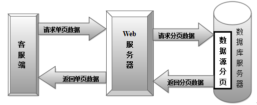 所谓内存数据分页【3】就是当客户端向 Web服务器发出查询请求时,Web 服务器响应请求并构建 SQL 语句发送到数据库服务器,数据库服务器执行 SQL 语句并返回整个结果集给 Web 服务器,Web 服务器再执行内存数据分页操作并把该页数据发往客户端,完成一次查询。内存数据分页的流程如图1所示: