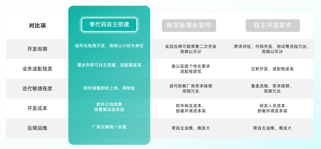 购买标准化产品的好处是,拿来即用,厂商在垂直细分领域有更丰富的经验。 但是各行各业,哪怕是同一行业同等规模的企业,其业务流程也可能千差万别。所以,标准化产品往往只能解决70%~80%的标准化需求,如果需要适配企业的业务,就需要在标准产品的基础上做二次开发,或者由厂商的实施团队驻场来帮助产品落地。标准化产品往往价格不菲,这对于中小企业来说将是沉重的负担。 但如果使用零代码平台,这个周期将会大大缩短—— 零代码开发平台将数据、流程、权限等封装成组件,只要你懂业务,哪怕不会编程,也能开发应用,大大减少了调研需求、评估和编写代码的时间。而且零代码应用可以快速响应业务的变化,做到即时调整,即时上线。 另外,市面上大多数零代码开发平台标准版的年费都在万元以下,这个费用对于大多数中小企业来说都是可以接受的。 (2)流程灵活,便于迭代和修改——为业务发展提供更多种可能想必很多老板都遇到过这个问题:想采购一个业务管理软件,但市面上这么多软件到底应该怎么选? 我们为成千上万家企业做过数字化系统,我可以很肯定的说,大部分老板在选择软件时没有想宄约旱降紫胍裁矗赡苎⌒褪奔父龉δ苈懔耍途醯胦k了,此时相当于你选择了这个软件厂商所倡导的管理流程,具体这个流程到底适不适合自己,要用上才知道。 有的企业跑一段时间就发现用不起来了,也有可能当前适合,但企业的发展不是一成不变的,未来企业出现了新的管理要求、有新的产品要适应新的市场模式, 总之,如果之前的管理软件无法满足需求,你只能面临三个选择: