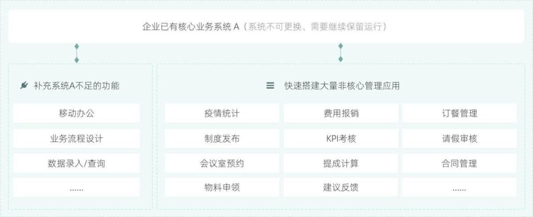 很多企业、组织会用过零代码平台去搭建核心业务管理系统,这样的案例很多,比如: ① 史丹利百得(制造型企业)通过零代码平台搭建了业务管理应用,并将零代码平台与人脸考勤设备、无线监控等设备对接,实现了智慧工厂管理; ② 蓝梦科技在零代码平台上搭建全公司经营系统,实现了流程规范化、管理透明化。公司信息化一年,节省开支200万,业绩增长133%; ③ OPPO(南京)在零代码平台上搭建了经销商管理、门店管理等业务应用,大幅提升业务效率; ④ 大竹县居保局(政府单位)通过零代码平台搭建了“码上办业务系统”,实现了全县百姓养老保险业务的线上手机办理,引起当地媒体多次报道。 第二种是:统一承接非核心业务的管理需求越是在信息化较早的中大型组织,子集团、部门、小组、个人的管理思想越难被落地。很多组织信息化脚步快,很早便用上了一套信息化系统。但随着业务发展,新的需求不断出现。不管是采购新软件还是代码开发,都避不开较高的经济成本、时间成本、落地风险。各部门面对非核心业务的管理需求时,态度非常保守,那通过零代码平台可以有效打破此类困局。