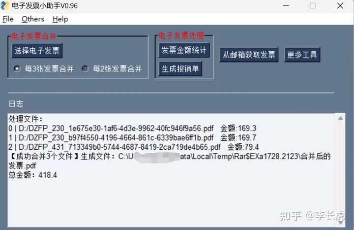 方案1:PDF发票合并工具(PdfInvoiceMerge) 方案二:电子发票小助手 方案三:pdftoa5(来自吾爱破解论坛jianghw) 方案四:发票闪印(来自pcbeta论坛) 方案五:电子票PDF合并工具(来自小罗清单) 方案六:传统方案:先合并所有发票到一个PDF中(推荐使用PDF补丁丁最新版或pdftk或qpdf,不少PDF工具合并发票,概率章会丢失),再打印成每张多页PDF 下载地址:链接: https://pan.baidu.com/s/1PWjLS4vWKvfRpVtNqzNqSw?pwd=fi96 提取码: fi96 方案七:懒人发票大师(自行前往官网下载 先说结论,上面七个软件我都试过,有些需要高版本.net框架没法安装启动,有些太复杂,推荐“方案七:懒人发票大师”,支持一次性批量选中所有发票,然后自动将A4页拼接2张的方式打印出来,一刀裁切即可,非常方便,使用前需要扫码登录,貌似是免费的,不知道是否打印多了后就要收费。 不少PDF工具合并PDF发票的时候,会导致发票上的红章消失。下面介绍一些工具或方法合并PDF发票(A5),把两张发票打印到一张纸上(两张A5合并到一张A4上)。 大部分PDF文件合并工具合并后,一般从第二张发票起,发票章才可能会有丢失的情况,如下: ![]() ![]() 我们今天的目标如下: ![]() 方案1:PDF发票合并工具(PdfInvoiceMerge)![]() 开源单文件绿色免费版,C#开发,调用的itext库,支持文件夹拖放,会自动添加文件夹内的PDF文件。可以看到它支持把一页放两张,四张发票,一页放三张发票很难吗?其实不难,有机会我再让它支持一页三张发票吧,没想到有人有这奇葩需求。目前纸张只能竖着,不能横着,如果我下次更新,让它支持横向。 原作者这个工具合并pdf是会丢失PDF章的,我对程序进行了修改,合并后章不再选择。如果选择一页合并一张的话,可以合并的PDF不止是发票,其它多页PDF文件一样全部合并,但这项不改变纸张的大小(就是普通的PDF合并工具)。 如果选择一页合并多张的话,合并时首先会把PDF展平(flatten),然后只会抽取每个PDF文件的第一页进行组装。 V1.0.0.1 合并PDF时会先对pdf进行展平(可以理解成pdf有像汉堡这种多层结构,像注释占一层,表单占一层,展平就相当于把面包拍平)。 方案二:电子发票小助手![]() 代码医生工作室(大蛇智能)的电子发票小助手,很明显是python写的,运行时需要管理员权限,不支持32位系统。合并发票,电子章不丢失,支持1页两张发票和1页3张发票,支持统计发票金额和生成报销单,支持从邮箱下载PDF发票,好实用啊! ![]() ![]() ![]() ![]() 方案三:pdftoa5(来自吾爱破解论坛jianghw)