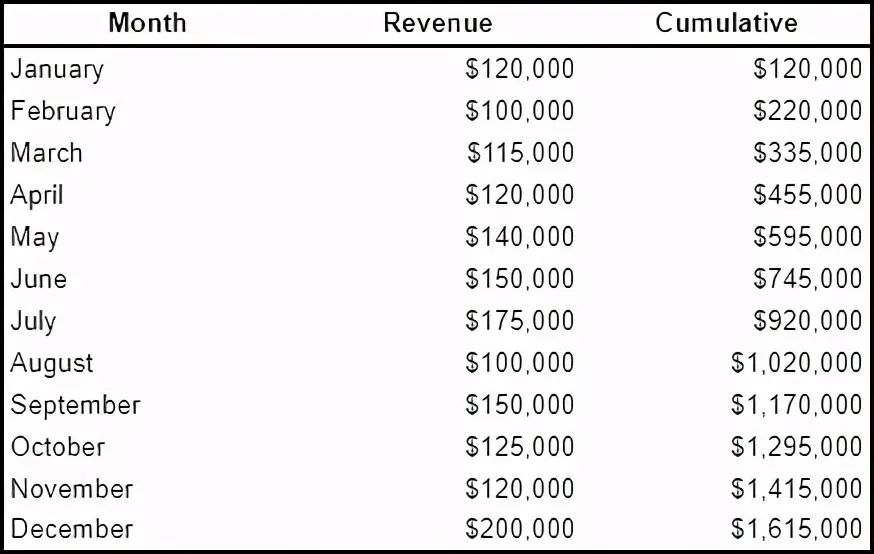 SELECT Month        , Revenue        , SUM(Revenue) OVER (ORDER BY Month) AS CumulativeFROM monthly_revenue