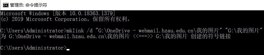 在打开的界面中,输入: mklink /d "G:\OneDrive - webmail.hzau.edu.cn\我的图片" "G:\我的图片" 其中,第一个引号内部前半部分为OneDrive所在的位置,也就是上述2中的自动同步OneDrive文件夹,例子中为 第二个引号内部为需要同步的文件夹路径与名称,例子中为