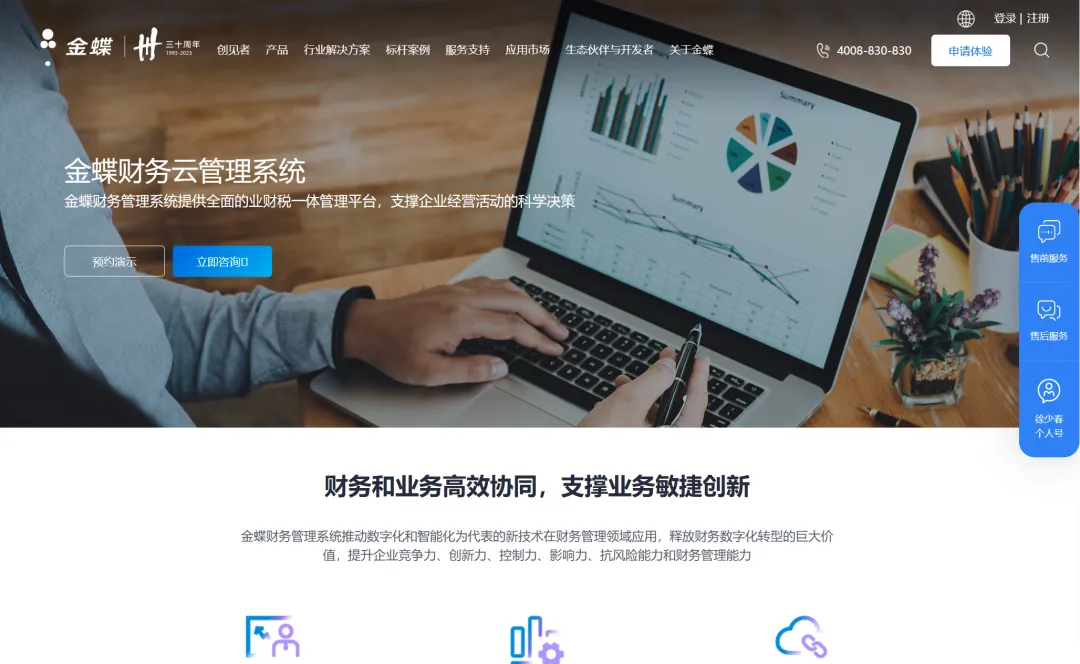 3、金蝶财务云 金蝶财务云管理系统提供全面的业财税一体管理平台,支撑企业经营活动的科学决策,助力大企业搭建对标世界一流的财务管理体系,与大企业共商、共建、共享财务管理新世界。致力于帮助企业实现财务和业务“融为一体”,财务赋能并成就企业中的每一个人,实现人人自我驱动;财务和业务“高效协同”,支撑业务敏捷创新。 推荐理由: