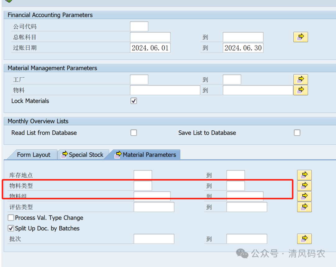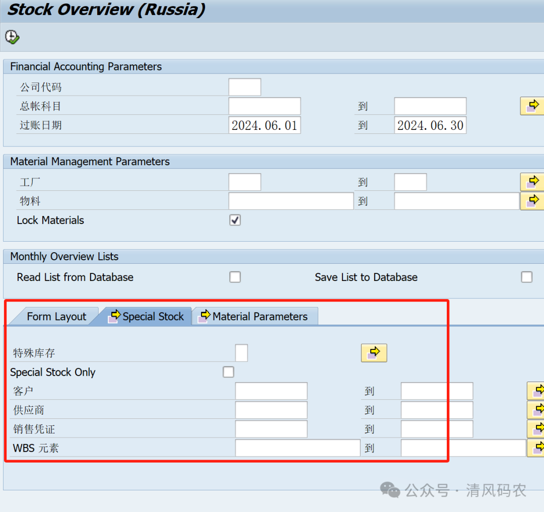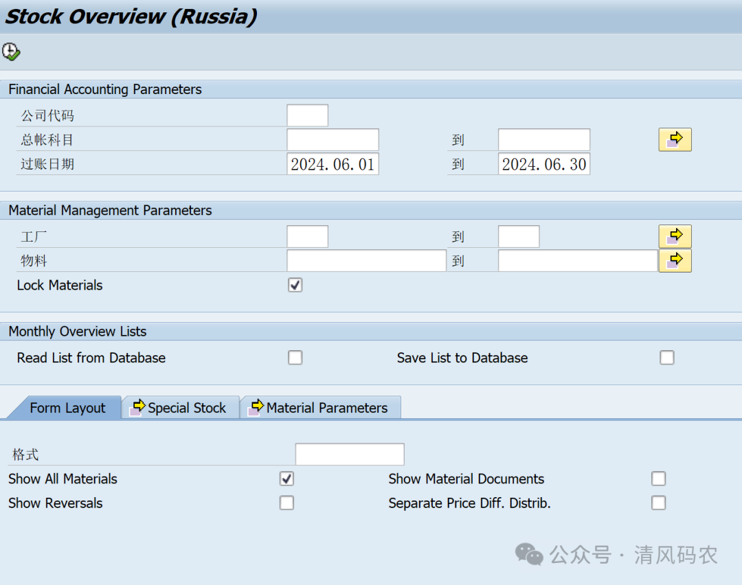 SAP中常用的收发存报表有MB51,MB5B,但是相对于这两个报表,还有一个俄罗斯报表J3RFLVMOBVED功能更为强大,这个报表当初是SAP公司针对俄罗斯开发的一张本地化报表,不过从ECC6.0以上版本中作为SAP的标准报表交付使用了。 菜单路径如下: 相比较MB5B,俄罗斯报表针对特殊库存对象可以根据客户(W库存),供应商(O库存),销售订单(E库存)等对象进行细致搜索和汇总。 此外,俄罗斯报表还提供了物料组,物料类型的搜索条件,这个也是MB5B所不具备的。 如下报表中清晰地体现了期初,期末,出入库的数量和金额,而且可以按照库存地点级别,由于SAP物料评估都是工厂级别的,所以MB5B也只有基于工厂级别,无法在库存地点级别显示金额,但是俄罗斯报表提供了这一个功能,并不是说它改变了SAP的物料评估级别,是因为它在运行报表时候贴心地动态计算了结果。 报表显示以下已评估库存类型: