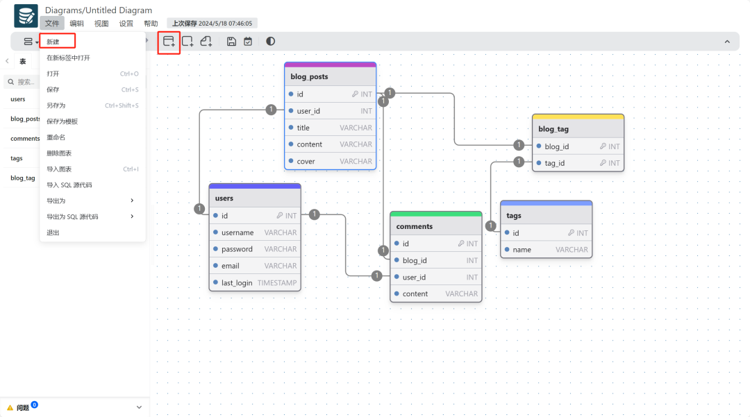 实体操作 使用drawDB,创建新的表或编辑现有表变得非常简单。只需选择界面左侧的“+”号,即可添加新表。表的属性,如列名、数据类型等,都可以通过表单直接编辑。
