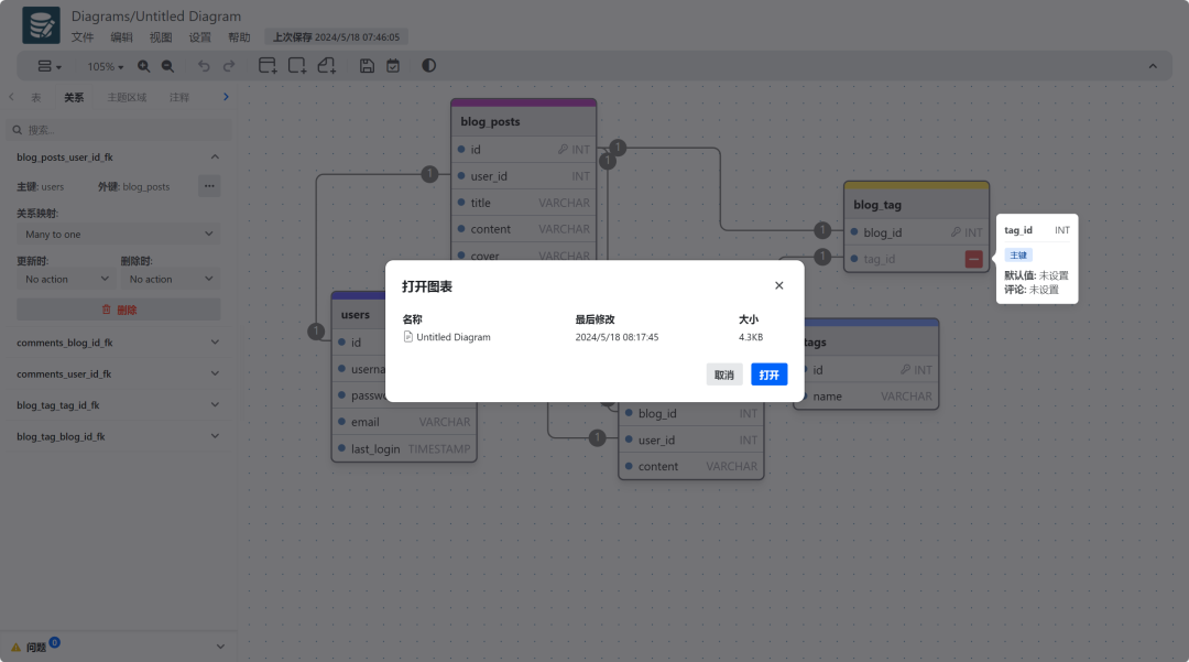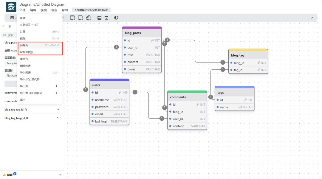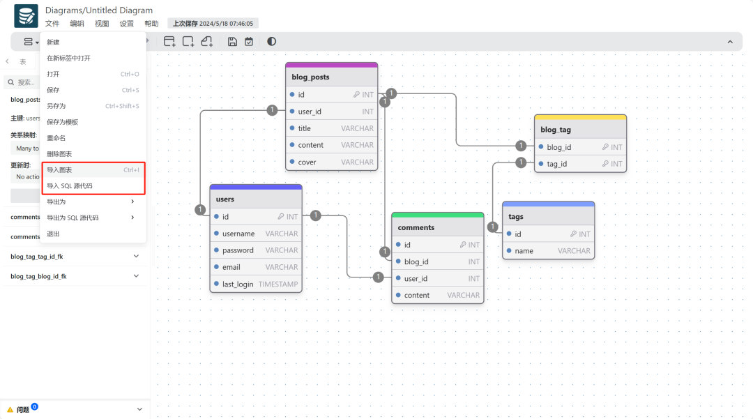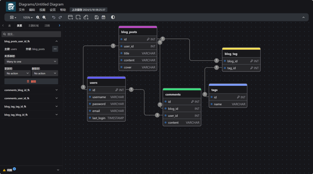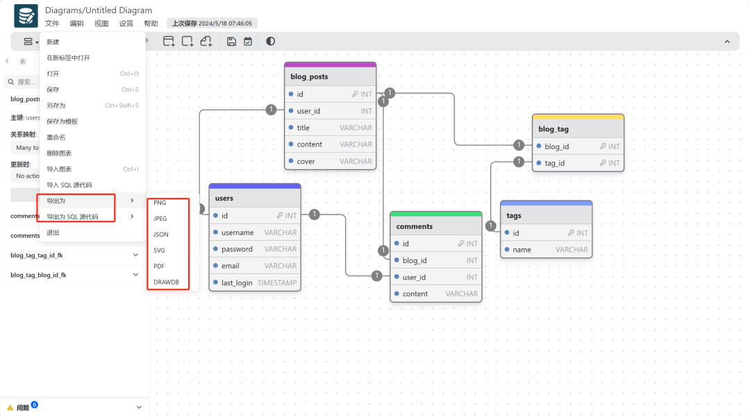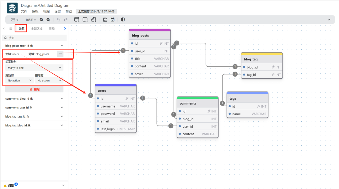 关系图构建 drawDB允许用户通过拖动来创建表之间的关系。无论是一对一、一对多还是多对多关系,都可以通过直观的图形界面轻松设置。