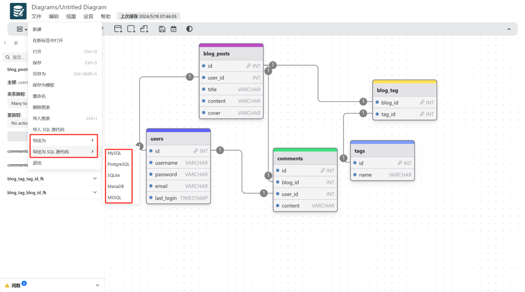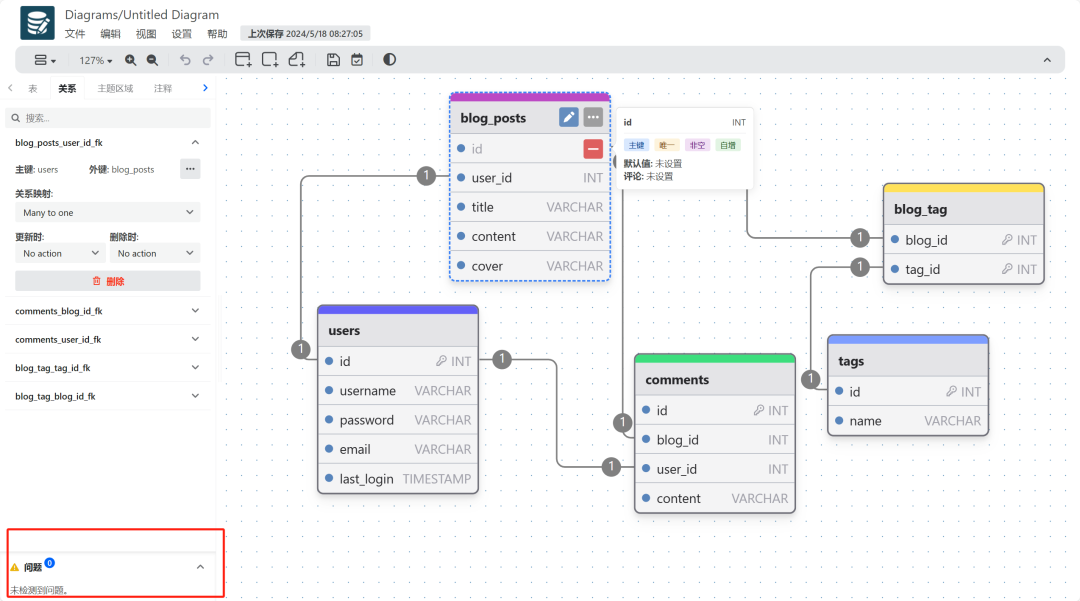 问题检测 drawDB内置的问题检测功能可以帮助用户发现并解-决设计中的错误,确保生成的SQL脚本准确无误。