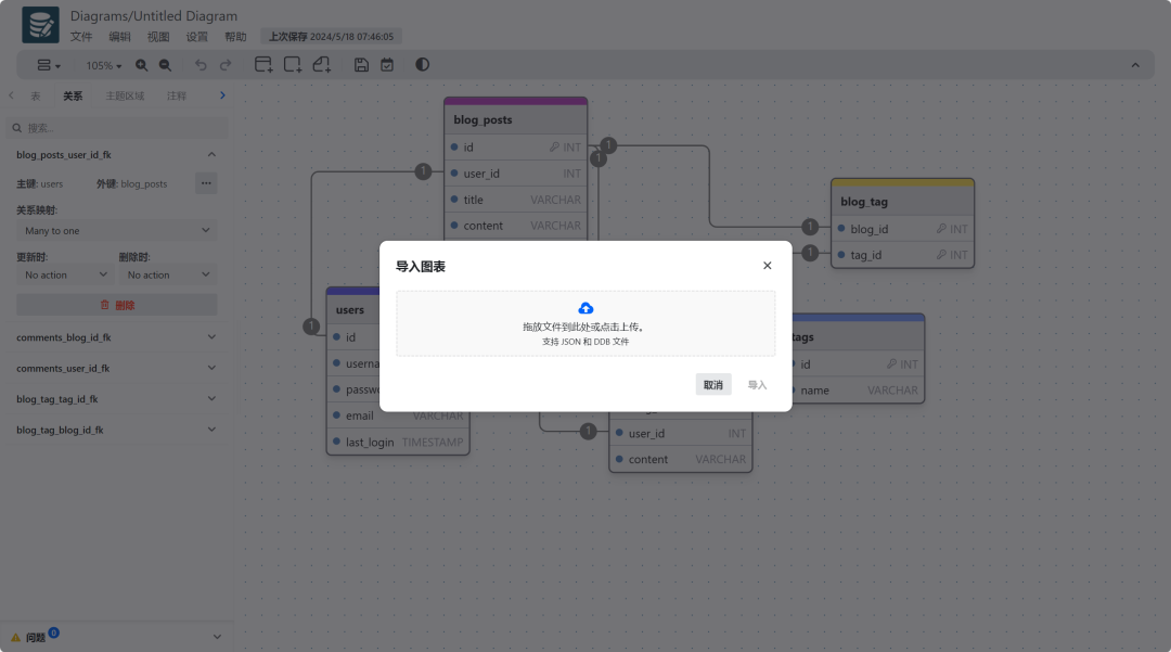 导入现有图表 如果用户已经有现成的数据库设计,drawDB支持从DDL脚本或JSON文件导入现有图表,节省重复工作的时间和精力。