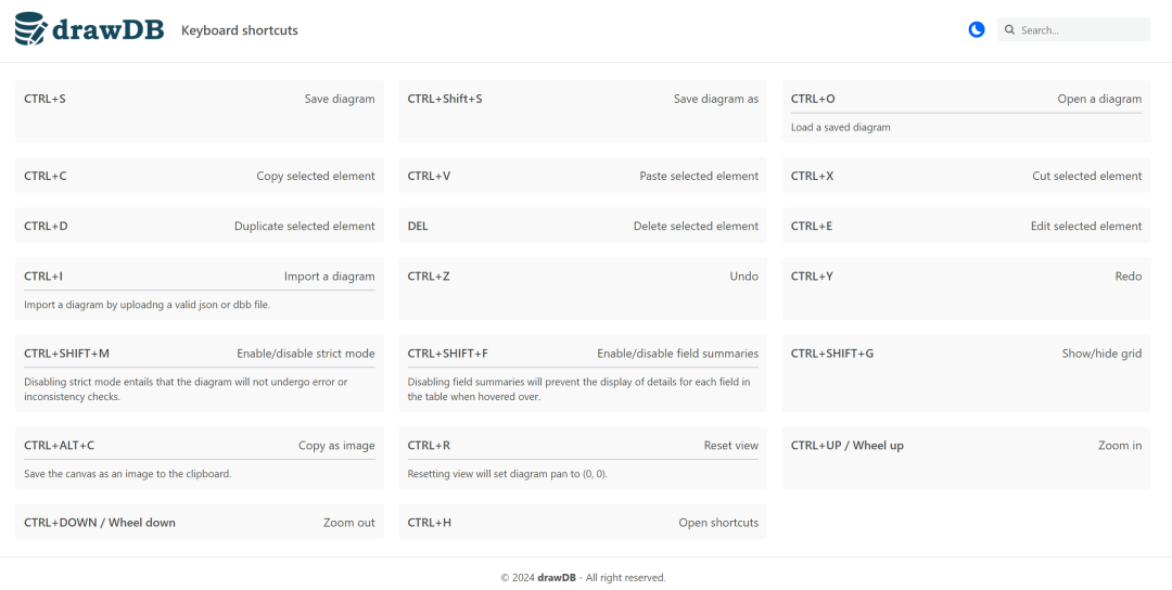 键盘快捷键 为了提高设计效率,drawDB提供了丰富的键盘快捷键,让用户可以快速执行常用cao作,如添加表、删除关系等。