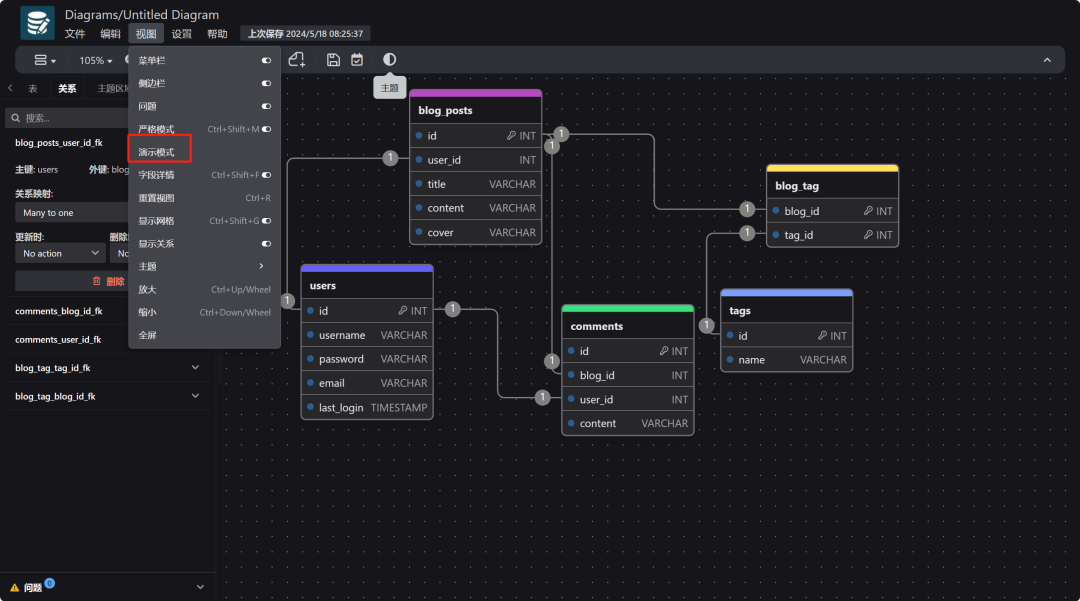 演示模式 在团队会议或演示中,drawDB的演示模式可以帮助用户更清晰地展示他们的数据库设计。