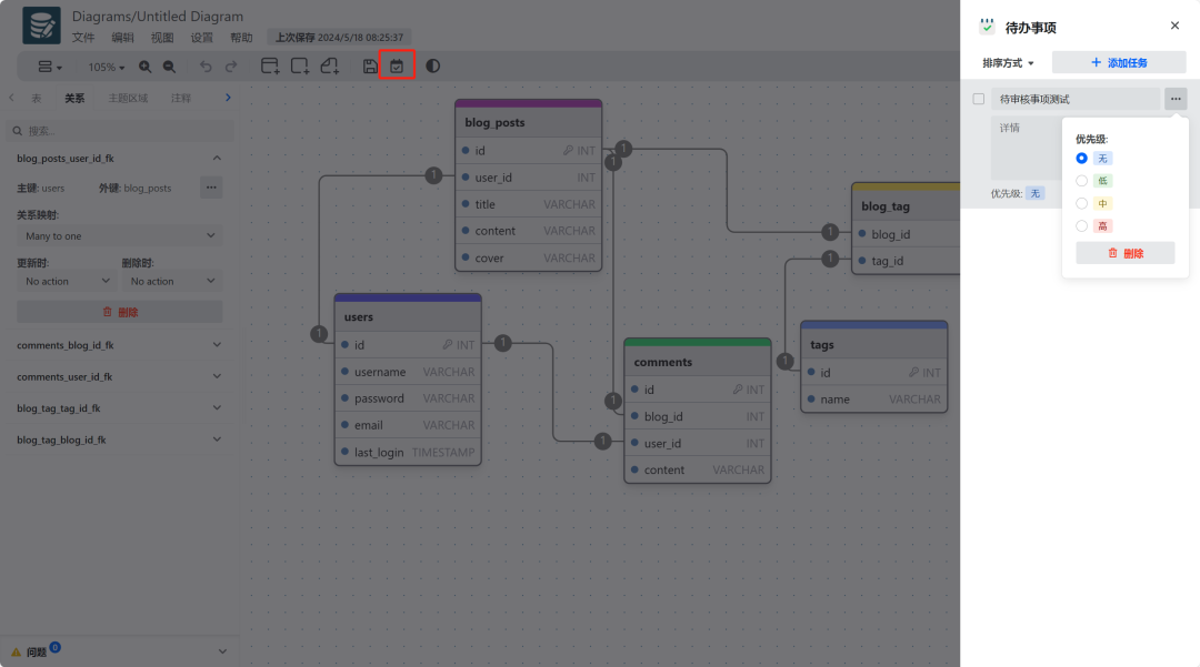跟踪待办事项 drawDB还提供了一个待办事项跟踪功能,帮助用户管理设计任务,确保所有事项都得到妥善处理。