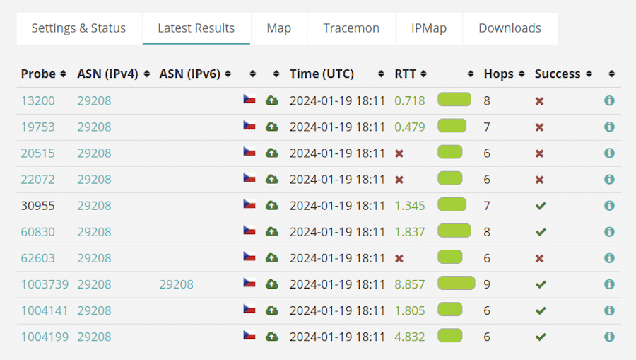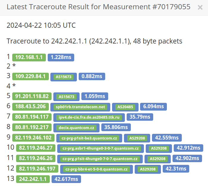 大约为50%,并不算太糟糕,但距离我们的期望还有很大差距。Quantcom还有使用了RIPE Atlas 探针的BGP下游连接,因此我也做了测试: