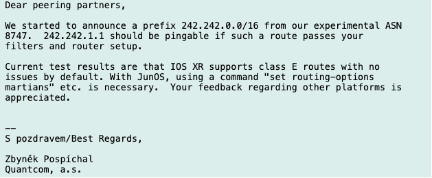 看到这封邮件,我非常惊讶。Quantcom的工作人员决定尝试使用E类,由于他们的客户使用了RIPE Atlas探针,我们可以进行“最佳案例”测试,检查真实的“SOHO”硬件如何处理E类空间:
