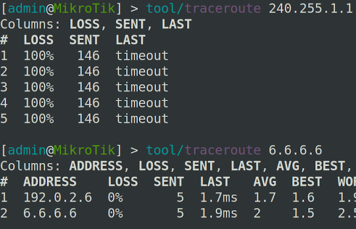 如果让MikroTik跟踪路由到位于诺基亚路由器后面的E类地址,它会设法将E类地址发送到诺基亚路由器,但是流量会丢失;而尝试使用“常规”的单播地址(例如 6.6.6.6)时,流量会被转发: