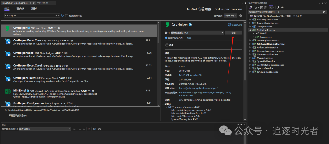 NuGet包管理器中搜索:CsvHelper,点击安装!