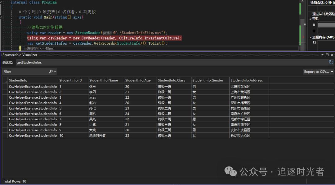 new StudentInfo { ID = 10, Name = "追逐时光者", Age = 23, Class = "终极三班", Gender = "女", Address = "长沙市天心区" }