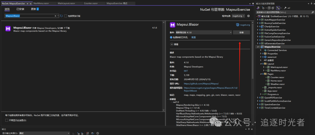 在NuGet包管理器中搜索:Mapsui.Blazor安装。