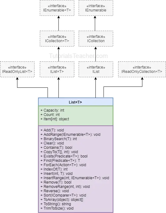• IListIList<T> 提供了数组的索引器、查找、插入等操作,几乎所有具体的集合类型都实现了该接口。