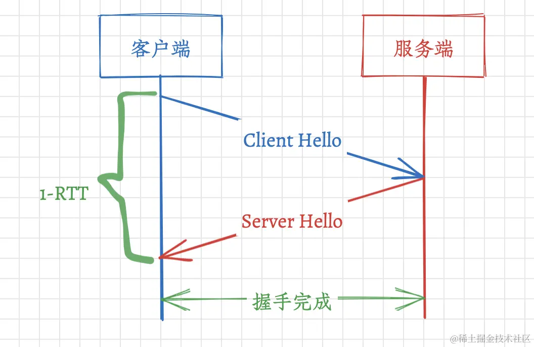 正是因为这样,所以,QUIC 建立连接的过程就是 TLS 建立连接的过程,如下图这样,首次建立连接只需要 1-RTT。