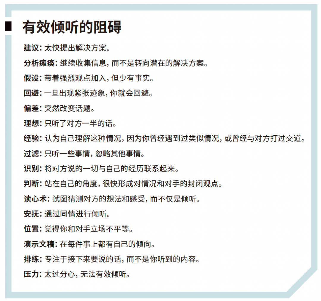 无论情况如何,谈判者必须记住,唯一能让别人朝着你的方向前进,并找到一个你同意的解决方案的方法,是深入倾听和理解,保证对方感到被看到、听到和理解。双方意见不合时,这样尤其有效。它使你能够建立信任,管理预期,并找到满足对方关键需求的方法。 在长达数十年的绑架和勒索谈判中,通过自身经验、观察和与该领域其他专家的交谈,我对高风险谈判中什么有效,什么无效,有了深刻理解。最近,作为企业和高管顾问,我了解到同样的规则可以应用于日常业务谈判中,以产生更好结果——无论要求更高薪水,争取额外的团队资源,还是与客户或供应商敲定合同细节。 无论情况如何,谈判者必须记住一个黄金法则:这不是关于你自己。唯一能让别人朝着你的方向前进,并找到一个你同意的解决方案的方法,是深入倾听和理解,保证对方感到被看到、听到和理解。双方意见不合时,这样尤其有效。它使你能够建立信任,管理预期,并找到满足对方关键需求的方法。这就是我所说的倾听的五个层次(level-five listening),也是有效谈判的基础。 正如欧内斯特·海明威曾说:“当人们说话时,仔细听。大多数人从来不听别人说什么。”脱颖而出的谈判者尤其如此。但这需要心灵和身体的自律,特别是在情绪高涨时。正确的心态和一套技巧工具可以提供帮助。 五层心态 许多人的倾听时间只够了解对方大意,然后就开始做出反应,或者开个小差去查看短信,或者在脑子里纠结另一个问题。这一级的倾听可以称为“间歇性倾听”,它无法帮你很好地理解对方,从而取得成功的结果。这也是一种不尊重。 第二层倾听只是为了反驳。你关注着接收的信息,直到它触动敏感点时才插话反驳。这样的插话会破坏沟通和融洽关系,因为显然你只关注自己的目标,而忽略了对方的议程。 在第三层倾听中,你要寻找逻辑:使用推理确定对方所说内容的实质和理由。这是一种进步,因为你在努力理解对方的论点,不过由于只是在你的头脑中进行,这样还不够。我们的目标是将全部注意力转移到对方身上,收集更多信息。 这发生在第四层倾听中,即你开始注意到对方立场背后的情绪和逻辑,并做出回应,表明你意识到了这些内容。你还可以通过“你似乎对我们的还价感到沮丧”或“你好像对这个提议充满热情 ”等评论,来促进更多对话。 第五层将移情好奇心向前推进一步。现在,你能通过倾听更好地理解和诠释对方的自我认知和观点。这使你能够提出促进双方发现和洞察的问题,并建立融洽关系,从而开始施加影响,实现合作或协作,所有谈判都应该达到这个结果。 心理学家卡尔·罗杰斯(Carl Rogers)和他的同事理查德·法尔森(Richard Farson)创造了 “积极倾听”(active listening)这一术语,用来描述我们“走进”对方的内心世界,真正理解他们所传达的信息的过程。两人在1957年出版的合著书籍《积极倾听》(Active Listening)中写道:“不仅如此,我们还必须向发言者传达这样一个信息,即我们正在从这个人的角度看待问题。” 沟通工具 但是,到底怎样才能向谈判对象证明,你对他们的逻辑、情感、观点以及最终愿望和需求给予了这种程度的关注,从而让他们开始把你视为合作者而不是对手呢?在我的世界里,我们使用MORE PIES记忆法,来确认保证和展示了五层倾听技巧。这不是一个在框里打钩的练习,而是一种训练注意力的方法,这样你就能更好地理解对方,产生共鸣。 → 最小的鼓励语,即非常简短的语言提示,“还有呢?”“真的吗?”“然后呢?”“嗯”“啊哈”“继续”和“有趣”等,是展示正在并保持关注对方的重要方式,特别是在打电话或对方已经说了一段时间时,目的在于鼓励对方继续说话并感到被理解。要以合理的速度调整感叹词(例如,每几句话就有一个鼓励语),如果是面对面,要保证自己的面部表情和肢体语言符合语气,无论是好奇、中立还是令人愉快。不要分心而用错鼓励语或过度使用 “很好”和“OK”等词,因为这些词暗示了你理解或同意,会让对方停下来。 → 开放式问题鼓励人们自由发言并分享观点,从而揭示更多关于他们认为重要或不重要的事,他们不能或不愿跨越的界限,以及可能妥协的地方。这些问题可以帮你争取时间、收集数据、消除误解,以及化解情绪,因为它们迫使他人真正思考他们的答案和潜在解决方案,而不是对一个想法做出下意识“是”或“否”的回答,或者不假思索地在你提出的选项间做出选择。 好的开放性问题从“什么”或“如何”开始,例如,“真正的问题是什么?”“这将如何影响[涉及的一方或情况]”“你要采取什么行动”“我们还有哪些选择”。避免以“为什么”开头的问题,因为这样听起来可能像指责和评判。例如,对于威胁要更换服务供应商的客户,不要问“你为什么想离开”,而是想着问“他们提供了什么我们没有提供的”或“我们怎样能让你留下来”。 → 回想或模仿对方刚说过的几个词或关键短语,是另一种证明你已经听到他们,让他们继续说下去,并建立关系的方式。在激烈快节奏的谈判中,这也可以给你时间平复情绪,组织适当回答或开放性问题。想象一下,一个网络攻击者威胁没在午夜前得到报酬的话,就要投放病毒(“病毒?”),或者一个供应商对你大喊,要求你的公司更快支付账单(“更快?”)。 通过仔细选择要反复的词,还可以将对话引向想要的方向。例