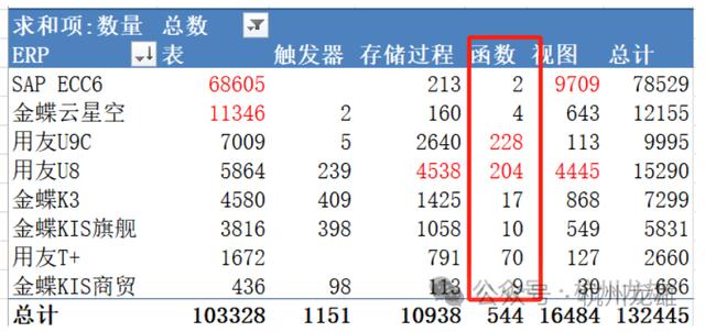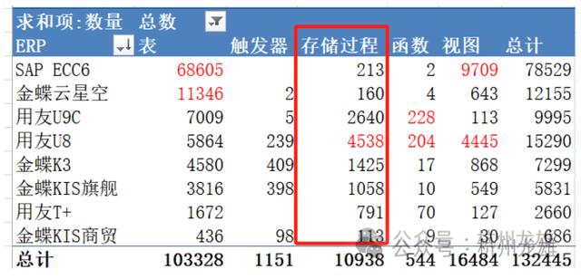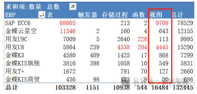 SAP 和U8 都大量使用了视图,数量分别达到9000多和4000多,云星空,K3 和KIS旗舰版 都是几百个。