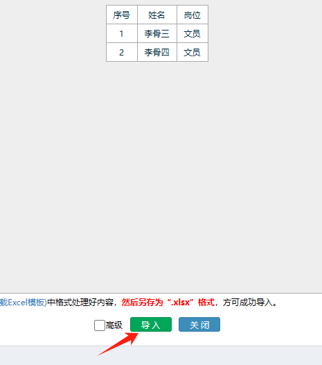 :点晴OA-如何批量导入用户名称![]() 点击进入 如下图: 点击批量增加 如下图; 点击批量增加 如下图; 点击选择文件 如下图: ![]() 点击导入 如下图: 点击提交 如下图: ![]() 导入模板:附件:批量导入用户模板.xlsx 该文章在 2024/6/28 11:17:39 编辑过 |