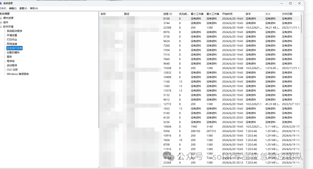 【Win+R】打开运行框,输入【msinfo32】命令打开系统信息,依次点击 "软件环境 -- 正在运行任务",可以查看到进程的详细信息,比如进程路径、进程ID、文件创建日期以及启动时间等。