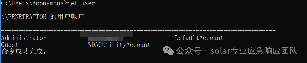 通过cmd命令框输入net user,查看系统中创建的用户。