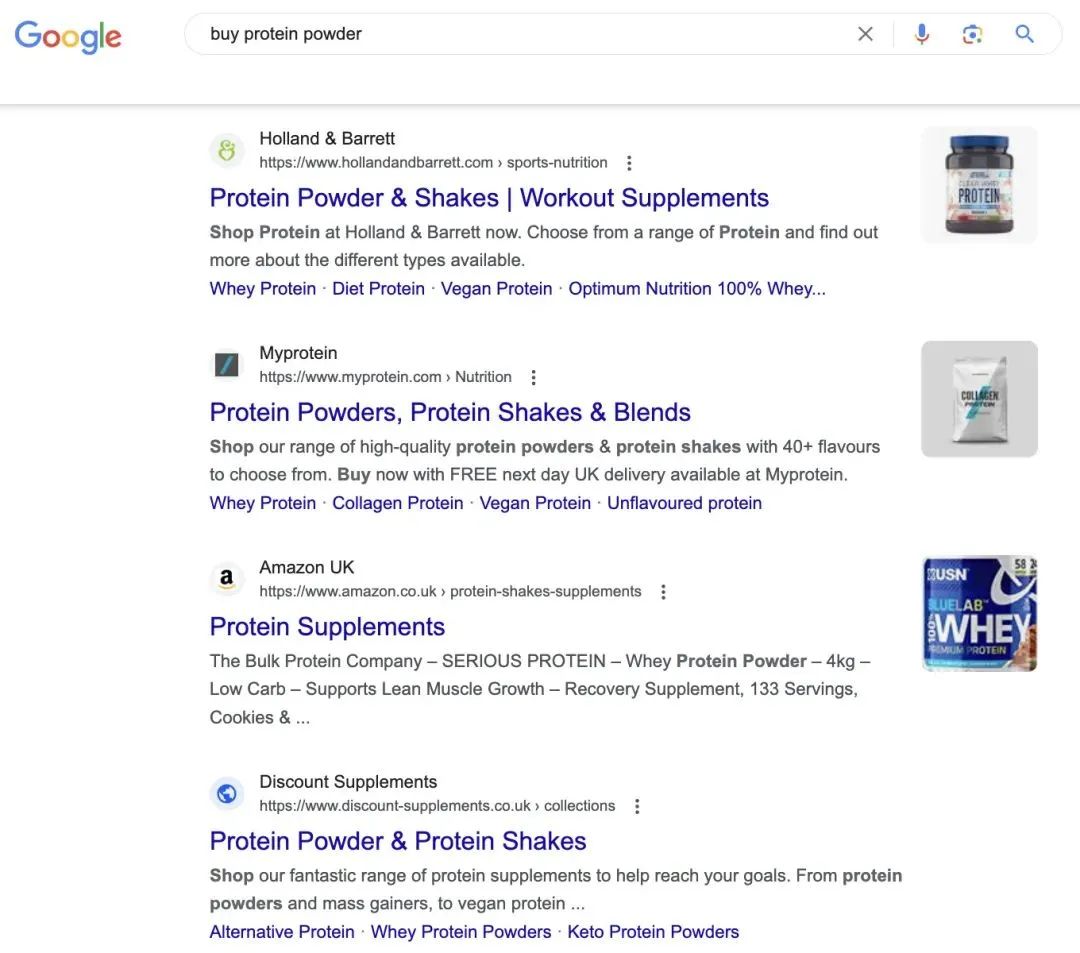 人们不是在寻找蛋白奶昔配方,而是想购买一些蛋白粉。这就是为什么排名前十的结果大多是电商网站的分类页面,而不是博客文章。