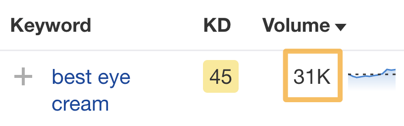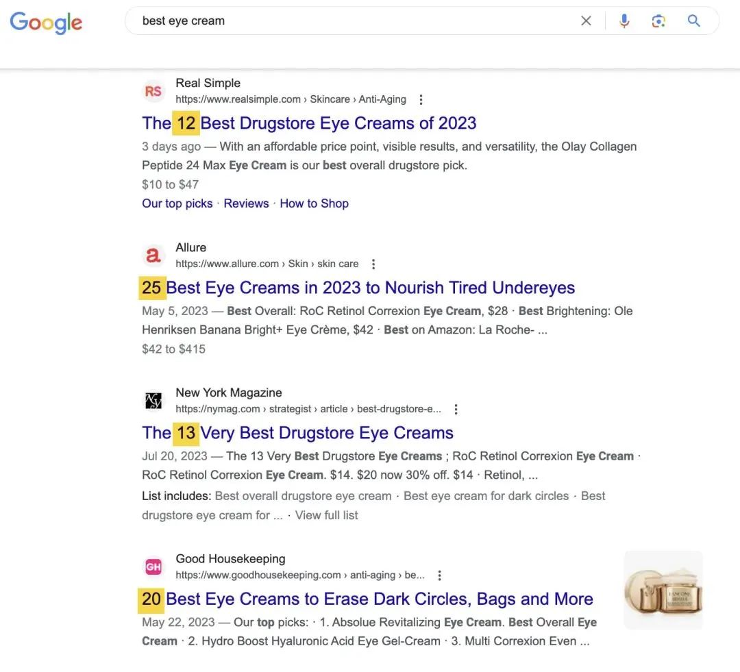 我们来看看 “best eye cream” 这个意图不太明显的关键词,据估计,它在美国的月搜索量为 3.1 万次。