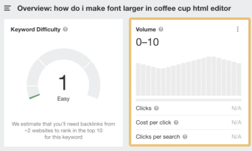 例如,你销售软件教程。针对 “how do I make font larger in coffee cup html editor” 关键词进行排名是没有意义的,因为它几乎没有搜索量: