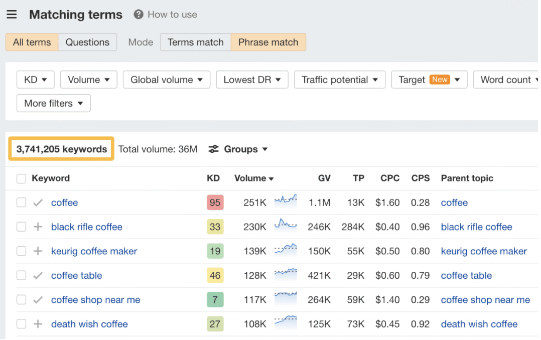要找到人们正在搜索的主题,你需要一个关键词研究工具,如 Ahrefs Keywords Explorer(关键词分析)。输入一个宽泛的主题作为种子关键词,然后进入Matching terms(词匹配)报告。