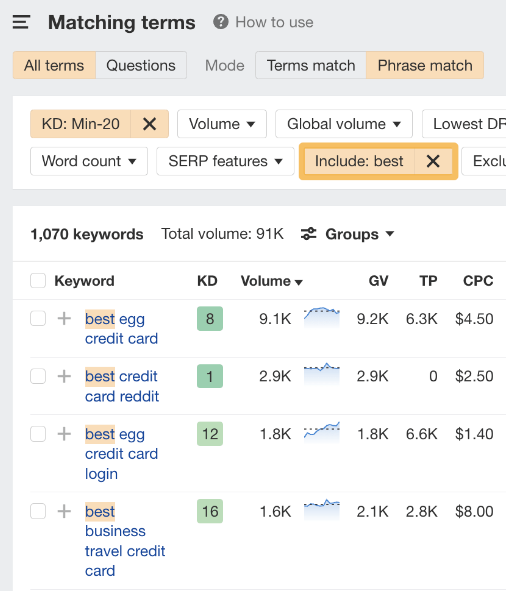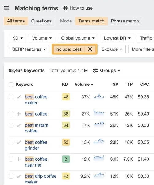 如果报告中的关键词不是那么相关,可以使用 “包含” 过滤器来缩小范围。例如,让我们过滤列表,显示只包含 “best” 的关键词。