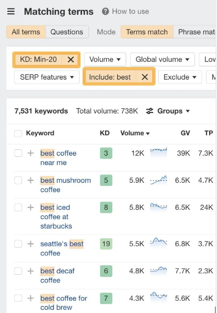 然后,你可以过滤出 Keyword Difficulty(关键词难度、KD)较低的关键词,从而筛选出容易获得排名的关键词: