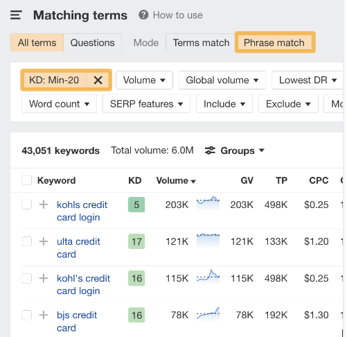 如果想批量找出低 KD 关键词,也可以使用 Keywords Explorer(关键词分析)。