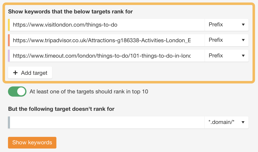 将三个排名靠前的网页的 URL 粘贴到 Ahrefs Content Gap(内容差距机会)工具中。底部字段留空,点击 “Show keywords(显示关键词)”。