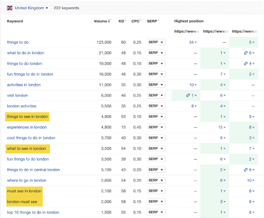 这里有 222 种 “things to do in london” 的变体,如 “things to see in london”、“what to see in london” 和 “must see in london”。