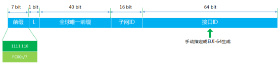 唯一本地地址前缀为FC00::/7,L为标志位,目前0被保留,L为1标识唯一本地地址,即FD00::/8