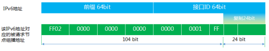 被请求节点组播地址由固定前缀FF02::1:FF00/104和对应IPv6地址最后的24bit组成