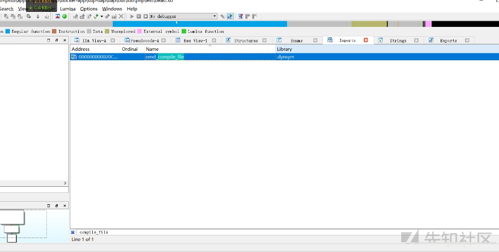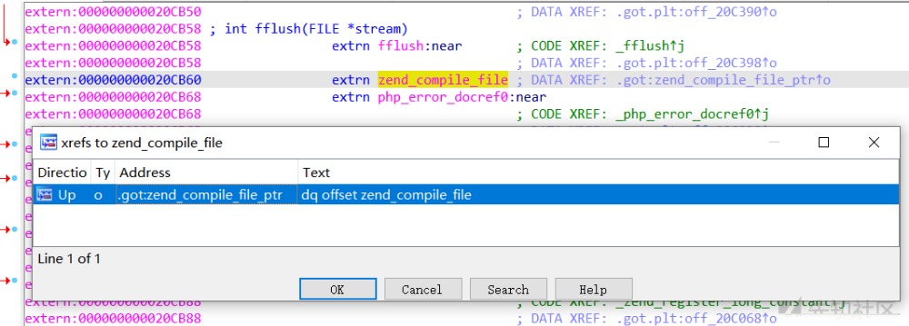 首先在导入表找到zend_compile_file。 这个函数会将php文件翻译成opcode。 因此大部分php加密扩展都需要hook这个函数达到拦截php文件载入和替换php文件的功能。