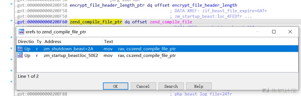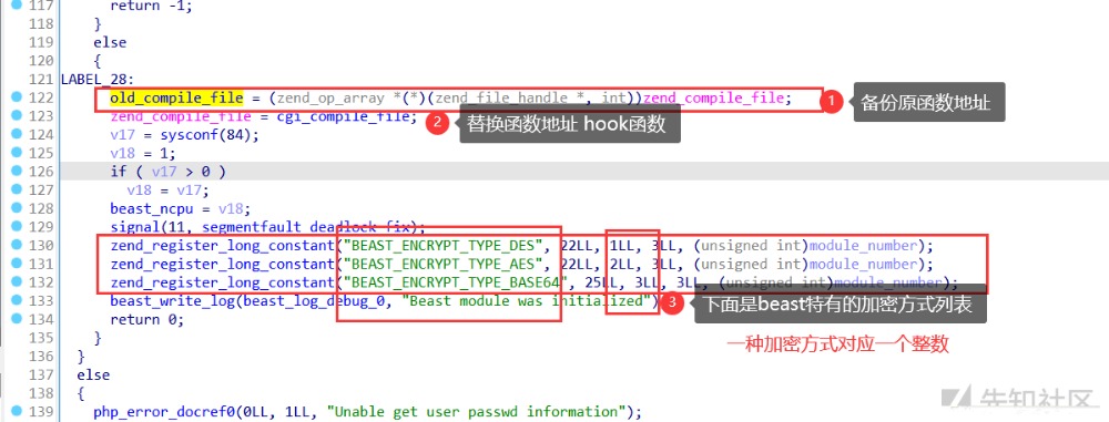 成功还原源代码 PHP扩展方案源代码混淆使用php扩展的代码混淆和无扩展代码混淆比较相似,只不过是把代码还原过程从php代码转到了php扩展。 同样是使用aes des 异或等加密方法直接加密php代码,HOOK翻译php的函数在翻译PHP文件前对文件进行解密操作。这种方案也可以完全还原出源代码。在无其他混淆和压缩时甚至还会保留注释。 典型开源项目:php-beast tonyenc screw-plus 手工解密这里以beast为例: 首先在php的扩展目录下找到beast.so。 beast的加密方案会把加密key编译进扩展中,我们只需要寻找key就可以完成解密。 beast由于是开源项目,有现成的符号表和源码这使得反编译寻找key变得非常简单。 但这样有点太简单了,所以这里演示的是在没有源码的情况下使用IDA分析解密流程。