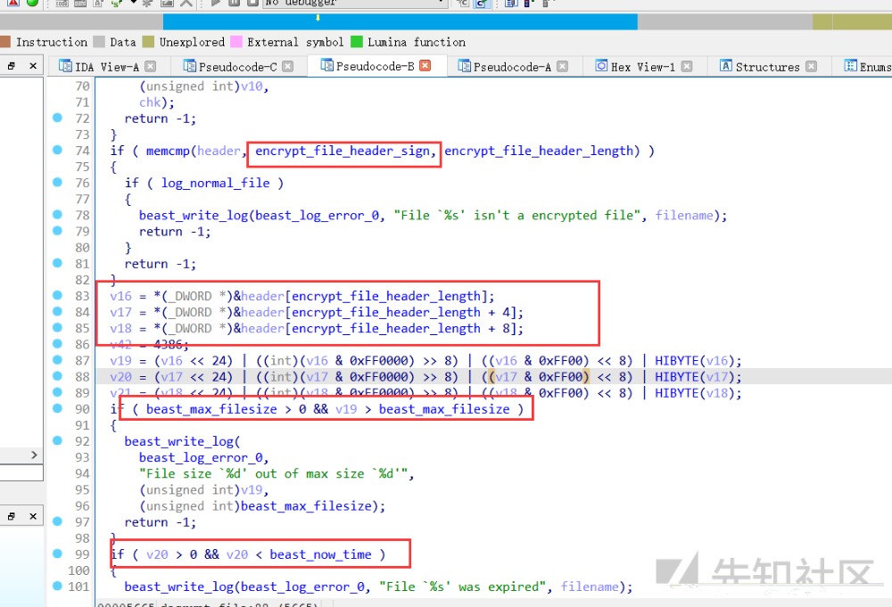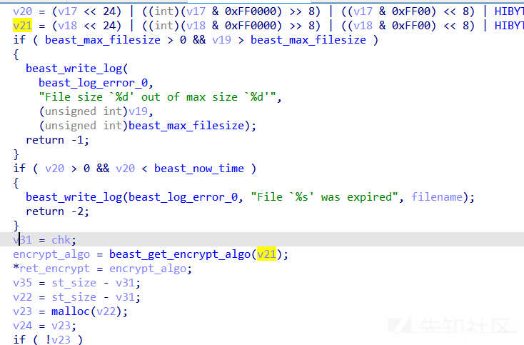 根据代码可以看出beast 加密文件的结构 | encrypt_file_header_sign 文件头标记(不固定 可修改)| reallen文件长度 int 4字节 | expire 到期时间 int 4字节| entype 加密方式 int 4字节| 加密后文件|