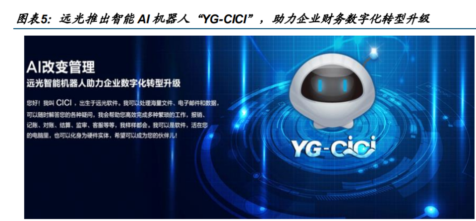 报表编制方面,SAP 的集团报表的公司间匹配、对账方案(ICMR)具有事务级别的匹配和实时对账、自动差异解决、应用内通信和工作流、基于不同组织维度(如公司、利润中心和合并单位)的灵活建模、匹配和对账中的高性能以及与组报表集成的公司间抵销等功能。其中,智能公司间对账 (ICR) 服务是基于 SAP Business Technology Platform (BTP) 构建的微服务。它可以处理训练和推断数据,并为 ICMR 的匹配引擎提供机器学习功能。 海外一级案例:VC 入局 AI+智慧财务,财会领域有望迎来数智转型浪潮 硅谷头部 VC 机构 Ycombinator 于 2023 冬季孵化营在“智能财务”方向将目光对准包括 CorgiAI、Hadrius、AiFlow 等在内的 7 家初创公司。基于其在财会金融领域将 AI 技术与公司产品业务紧密结合,得到了 Ycombinator 的重点关注和投资认可,标志着其有望成为着最前沿的 AI 创业方向。 有望受益 1:远光软件,AI 赋能管理,智能机器人助力企业财务数字化转型升级 远光软件在“AI+财务”领域积极探索,深入挖掘人工智能在企业财务管理方面的应用潜力,推出智能机器人 YG-CICI,可以海量处理文件、电子邮件和数据,完成报销、记账、对账、结算等多种日常繁琐工作,部署简单、高效运行、不干扰用户工作,成为企业优化业务流程、实现智能转型升级最便捷的方式之一。