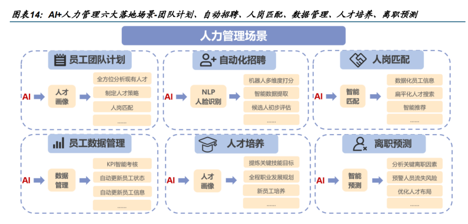![]() 人力管理场景:数字人力指日可待,AI 赋能企业人力资源管理 场景透视:AI 赋能“团队计划+自动招聘+人岗匹配+数据管理+人才培养+离职预测”六大场景 人力资源管理旨在通过与劳动力招聘、劳动力管理和劳动力优化相关的一系列实践,提供创造组织价值并满足组织特定需求的特定能力。人力管理场景的智能化基于 AI、ML、神经网络和 DL,将 HR 任务自动化,实现无缝工作流程和直观工作环境。AI 在人力资源管理场景革新招聘到退休全流程,完善人才管理,提供更丰富的员工体验,并将员工体验与企业业务目标紧密链接,完成计划制定、招聘、人岗匹配、员工数据管理、职业发展规划和离职多个环节的持续优化。