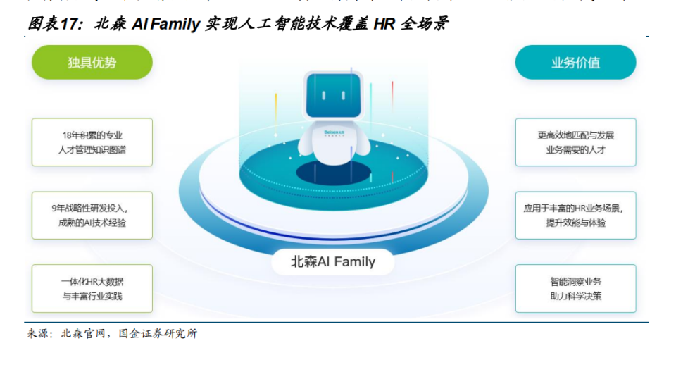 ![]() 标杆案例:SAP,AI 解决方案革新人力资源管理全流程 员工团队计划方面,SAP AI 解决方案利用智能人员配置分析功能,制定人力资源战略,优化劳动力计划。自动化招聘方面,SAP Fiedldglass 解决方案利用智能简历筛选功能发现最优应聘者,通过职位匹配门户,增加应聘者申请率;通过 O*Net 职业分类代码建议,准确提交职位发布。人才培养体系方面,SAP SuccessFactors 解决方案为员工提供定制学习建议以保持竞争力;通过展示其他员工成功故事引导员工成长。员工数据集成方面,SAP Concur 解决方案借助 AI 技术增强的政策审计功能解决关键问题;发票扫描及表单填写流程增加为费用提交增效。SAP SuccessFactors 解决方案借助数字助理快速解决员工任务;利用个性化员工主页处理最相关信息。 有望受益 1:汉得信息,搭乘“AI+人力”转型快车,赋能人力数字化全场景升级 汉得赋能人力数字化全场景升级,有望在 AI+人力场景下不断受益。汉得的自研人力资源管理解决方案布谷(BooGoo)人力资源管理系统具备核心人事构建、支撑人才供应链、移动智能服务、人力资源共享服务建设和人力资本智能分析等多项核心能力,致力于为企业提供人力资本管理业务变革的合适建议,建立一体化、全覆盖的 AI+人力数字化平台。 有望受益 2:北森控股,国内 HR SaaS 领军,积极探索 HR 场景下的 AI 新价值 北森系国内领先的人力资源科技公司,已连续六年位列中国 HCM SaaS 整体市场排名第一。公司深耕于 HR 领域 20 余年,通过创新的一体化 HR SaaS 及人才管理平台 —— iTalentX,帮助企业实现覆盖员工全生命周期的数字化管理。公司正在积极布局人工智能技术与人力资源管理场景的融合创新,加快底层平台和产品的研发迭代速度。公司不久前接连推出覆盖人力资源全场景的“北森 AI Family”、“小森” 智能机器人,致力于打造 HR 全场景 AI 赋能,通过人才甄选、自助服务、业务洞察、流程自动化等流程数智化,帮助企业匹配真正需要的人才,提升组织效能,助力科学决策。
