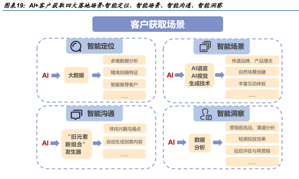 ![]() AI+CRM:画像定位“神机妙算”,营销洞察先人一步 客户关系管理的核心在于对商机线索的把控以及对客户心智的抓取,AI 画像通过精准分析客户需求,把握营销时机,做到营销洞察“先人一步”。 客户获取场景:挖掘销售线索,AI 赋能客户获取 场景透视:AI 赋能“智能定位+智能场景+智能沟通+智能洞察”四大场景 获客分为潜在客户群体寻找及制定差异化推广营销策略两步,而有价值的销售线索可能因人力的疲惫疏忽错失,营销策略也需员工进行数据收集、受众分析及内容创作等环节,存在时间及策略上的风险。AI 大模型有望助力客户获取节省人工分析成本,进一步提高获客效率。
