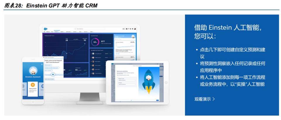 AI 突破了传统的客服管理与服务模式,帮助企业构建全渠道信息收集、全天候服务管理、精准客户洞察的完整客户联络体系,实现客户服务质量与和服务效率双重提升。及时响应:AI 具有出色的倾听和理解语音交互能力,能够及时响应客户、提高首次联络解决率,并缩短处理时间。例如,智能客服机器人等工具能保持对客户的 24 小时全天候自动化服务,解决非工作时间无人值班应答的问题,保障响应速度及业务连续性。充分洞察:AI 通过对客户沟通数据的分析和挖掘,精准捕捉用户标签,总结用户偏好模式,生成对应营销及沟通话术,提高服务及推荐精准度。全渠道服务:AI 技术可以实现全渠道访客接入,通过网站、APP、微信公众号、小程序等多种渠道服务客户。客服管理的接入渠道更加丰富,多媒体的交互形式也为客户提供了更多惊喜。确保了无缝的客户体验,有效提升客户咨询过程的流畅度与满意度。 标杆案例:Salesforce,推出首个 CRM 生成式 AI Einstein GPT Salesforce 推出了全球首个 CRM 生成式 AI:Einstein GPT。Salesforce 拥有世界排名第一的 CRM 和世界上最强大的客户数据集,这使得 Einstein GPT 能以其他公司无法比拟的方式生成 AI 内容。