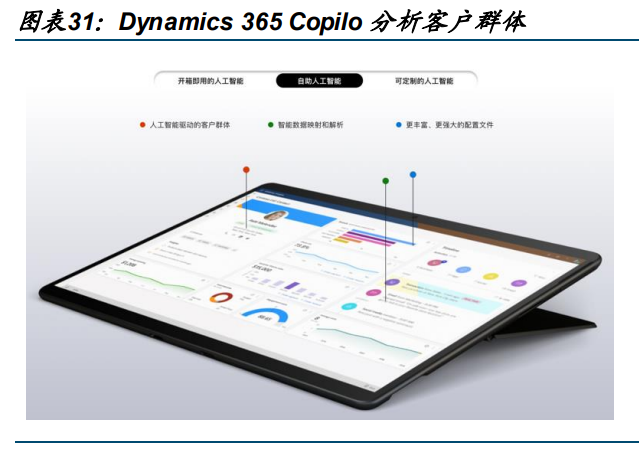 智能物流:通过机器学习预测趋势,AI 能更加智能和高效地优化每个订单的交付时间及成本。例如,对于送达超问题,AI 能够自动调整策略加快配送速度,还能根据天气和其他相关数据预测物流配送的潜在风险,采取提前改换配送渠道或者更新发货仓库的应答方式。 标杆案例:微软,Copilot 精准定位客户群体,电商行业应用前景广阔 典型案例:Microsoft 在洞悉消费者诉求方面,借助 Dynamics 365 Customer Insights 中 的 Copilot,能够生成高度定制化和目标明确的客户分类,应对复杂的计算并且准确定位特定客户群体。更替产品信息方面,Copilot 能在几秒钟内自动生成在线商店商品简介,包含产品的颜色、材料、尺寸等特性,并能对描述的调性、格式、长短进行定制。