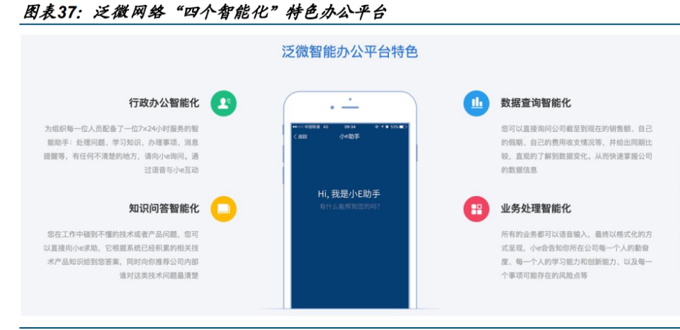 跨平台数据查询:智能工作助手通过接入多个平台数据,通过智能语音助手的形式协助企业员工、企业管理者进行跨平台数据查询,让工作更加便捷。简化办事流程:智能工作助手通过问答式对话,解决员工在行政事务、日常办公中对办事流程不熟悉造成的时间和精力浪费问题。个人秘书:工作助手能够在日常消息提醒、业务问题回答、技术难题指导等方面给予员工帮助,并为员工安排每日待办事项,进行智能时间规划,提升工作效率。 标杆案例:泛微网络,国内 OA 龙头,“四大智能化”办公平台助力协同提升效能 泛微网络是国内 OA 行业龙头企业,专注于协同管理软件领域,主要为政企客户提供统一的数字化办公平台。泛微独创的 OA 办公平台具备“四大智能化”特色——行政办公智能化、数据查询智能化、知识问答智能化与业务处理智能化,满足公司各类管理场景的需求。泛微 OA 平台功能强大,如跨平台数据查询方面,泛微智能办公平台能够直接询问公司截至目前的销售额、个人假期、费用收支等情况,并给出同期比较,帮助员工直观了解数据变化。简化办事流程及个人秘书方面,泛微智能办公平台的“小 E”是每位员工的 7×24 小时智能助手,为员工在处理问题、学习知识、办理事项、消息提醒等方面答疑解惑,并对技术和产品问题提供参考等。