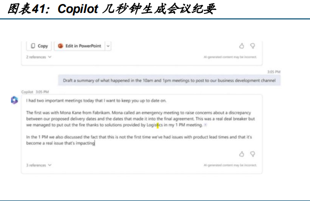AI 为会议管理场景在会议信息管理、会议内容整理总结、会议历史记录梳理和非与会人员信息传递等方面存在进一步赋能的空间。会议信息管理:会议管理场景中下的会议助手能够确认参会人员,做到信息及变更及时通知、开会提醒以及会后报告发送等操作,有利于员工进行时间管理,让团队协作更加丝滑。会议内容整理:AI 在生成会议内容整理方面存在较大应用空间。通过语音识别、逐字记录实时同步会议进程,定期生成可视化摘要,并智能推送初步方案建议。语言方面,AI 翻译能够协助跨国团队进行更顺畅的团队交流,生成多语言会议纪要。会议记录梳理:对于某一重要业务或重大事件的商讨及合作,一次会议无法解决问题,往往存在系列会议。AI 纵向整合历史会议的零碎要点,形成完整的事件框架,帮助企业明晰核心脉络,提高沟通效率。非与会人员信息传递:非与会人员通常通过观看视频回放或阅读会议纪要的方式了解会议内容,缺乏效率、时效性与准确性。通过人机交互,AI 能够实现问答式输出会议内容,快速解答用户关心的方面,大幅减少信息传递时间。 标杆案例:微软,Copilot 高效汇总整理会议信息,为 Teams 会议转型赋能 会议信息管理方面,Microsoft 借助 Microsoft Graph 将来自用户的 Word、PPT、电子邮件、日历、备忘录、联系人的数据汇集在一起。用户可以要求 Copilot 准备与某位客户的会议,Copilot 就会汇总各种来源的信息,在几秒钟内整理出一份总结报告。会议内容整理方面,Microsoft 的 Teams 通过输入相关指令,Copilot 能够实现实时总结、归纳会议要点,给予关于后续讨论和待办事项的建议等功能。会议记录梳理方面,Microsoft 能一次性生成多个会议的纪要并进行简要总结,鼠标悬停在文字上,就能获取更多详细信息,以便及时查漏补缺。